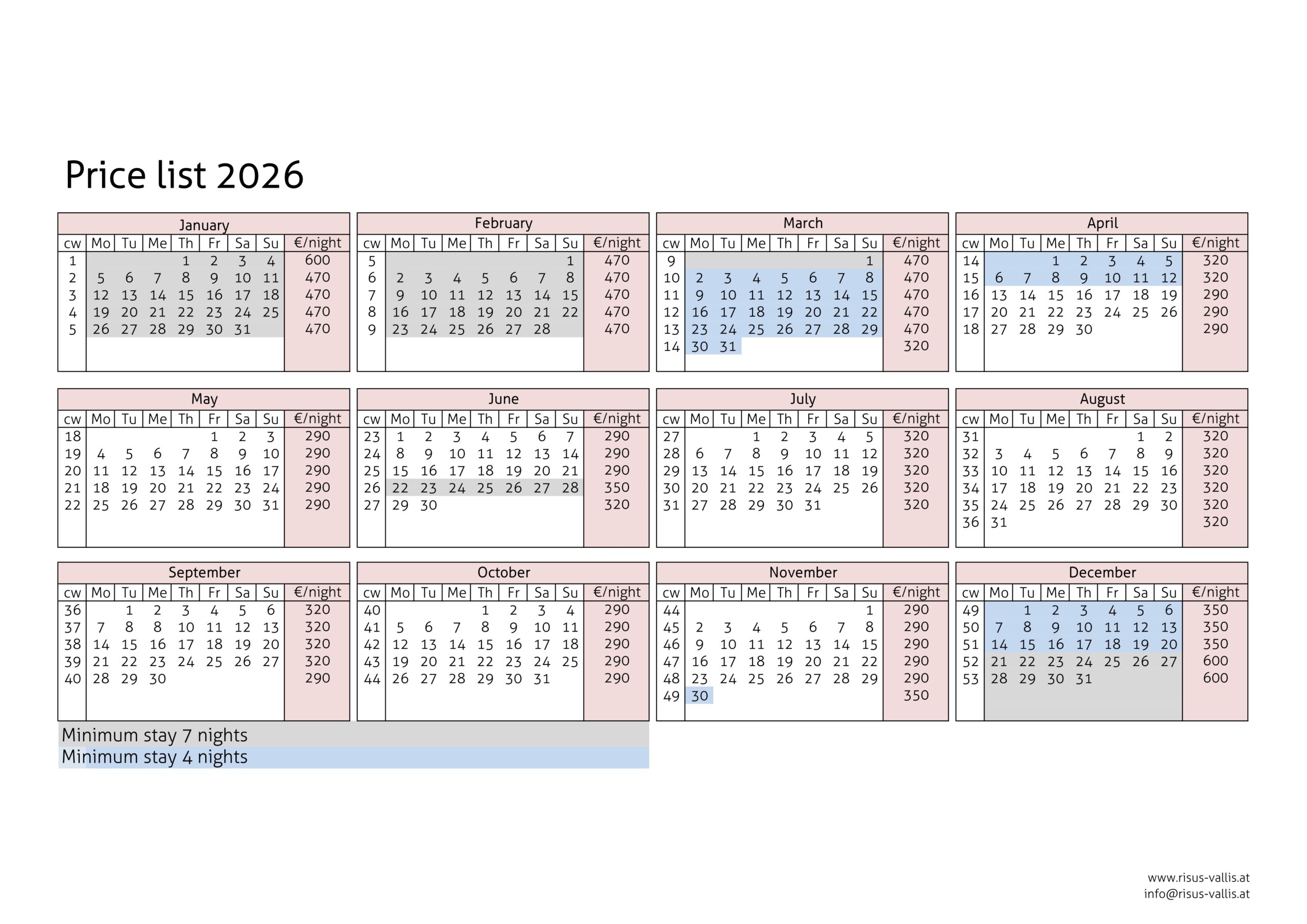 The deposit is 500 € and will be returned after your stay, should there be no reason to withhold it. The general Risus Vallis terms and conditions apply.